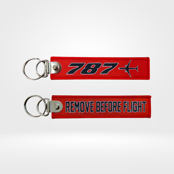 A stylish red fabric keychain featuring an embroidered top-view silhouette of the Boeing 787. Durable, lightweight, and perfect for aviation enthusiasts, pilots, and collectors. Great for keys, bags, or everyday use.