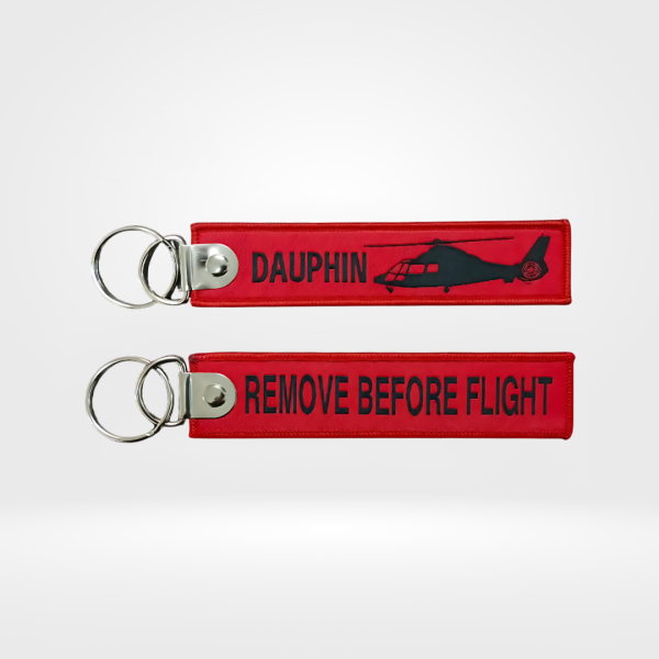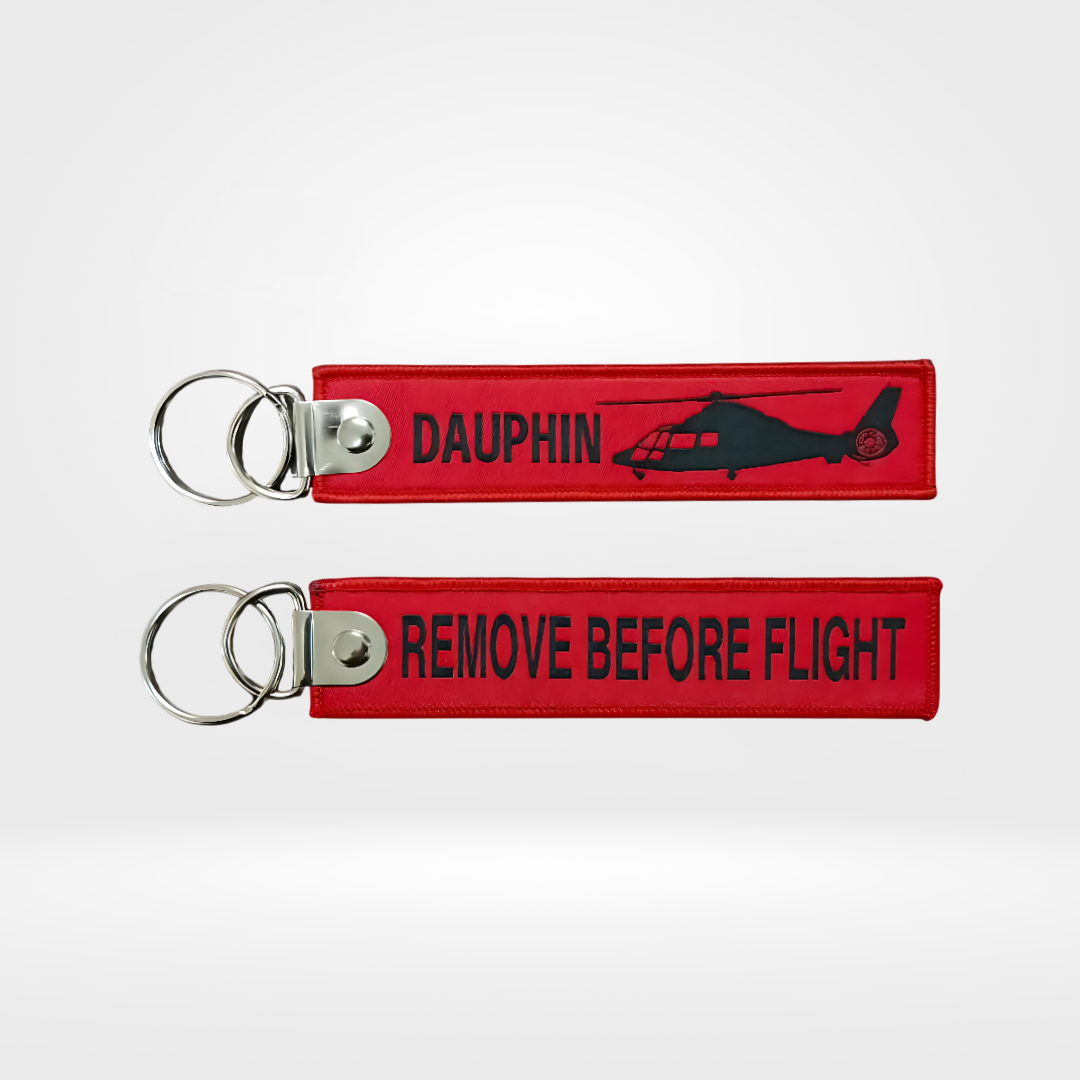 Add a rotary-wing icon to your collection with the Dauphin Side View Red Fabric Keychain. Inspired by the sleek profile of the Eurocopter AS365 Dauphin helicopter, this aviation-themed fabric keychain features a detailed side-view silhouette on a striking red background.