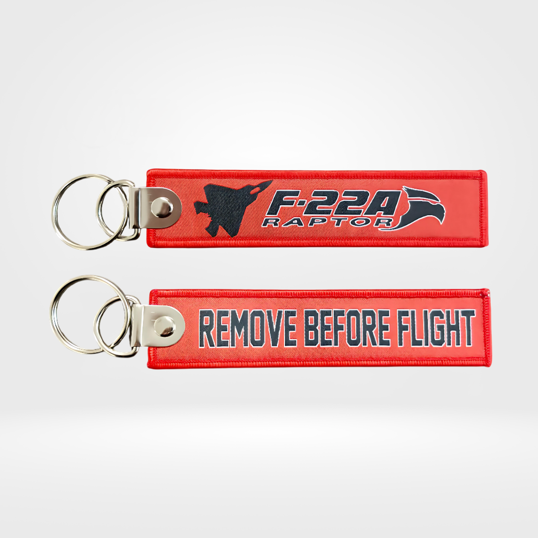 A striking red fabric keychain featuring an embroidered top-view silhouette of the F-22 Raptor. Lightweight, durable, and perfect for fighter jet enthusiasts, pilots, and collectors. Ideal for keys, bags, or everyday carry.