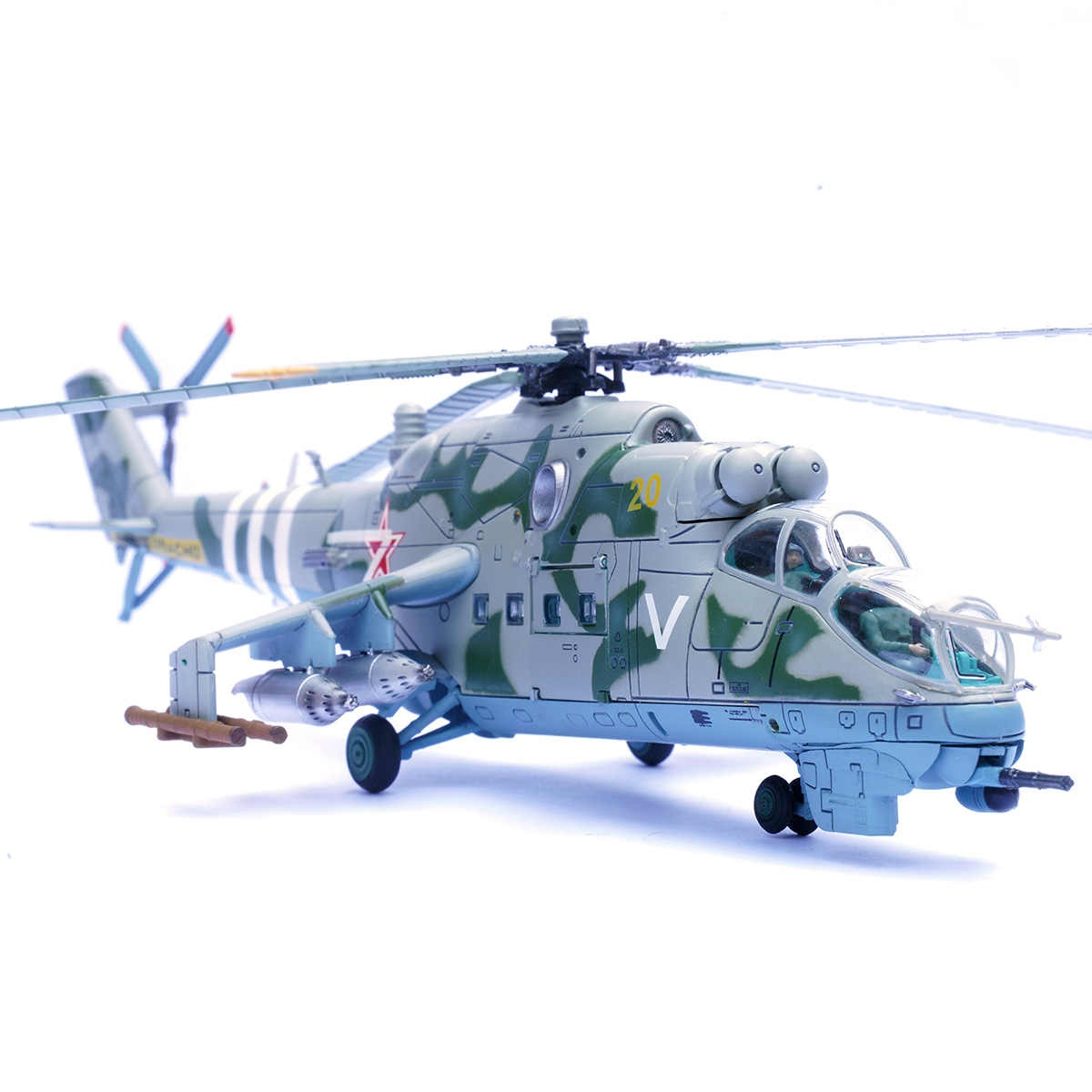 This die-cast model replicates the iconic Mil Mi-24V “Hind-E” attack helicopter as used during the 2022 conflict near Zaporizhzhia — hence the “Zaporozhye 2022” designation. The Mi-24V is one of the more robust and versatile attack helicopters ever fielded: a twin-engine, armored gunship with both heavy firepower and troop-transport capability. In real life, the Mi-24V could carry up to 8 fully equipped troops, act as a heavily armed gunship, and deliver rockets, missiles, and machine-gun fire.