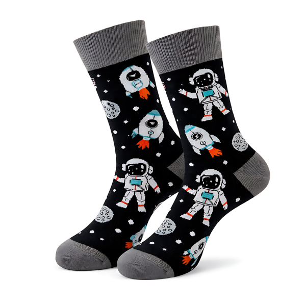 Prepare for liftoff with a design that captures the classic era of space exploration. These socks feature a deep midnight-black base that sets a dramatic stage for a repeating pattern of waving astronauts, soaring rockets with fiery orange thrusters, and cratered moon illustrations. The sophisticated slate-gray accents on the cuffs, heels, and toes provide a grounded, professional finish that balances the playful space graphics. Soft and durable, they are designed to keep you comfortable through every “mission,” from the boardroom to the backyard.