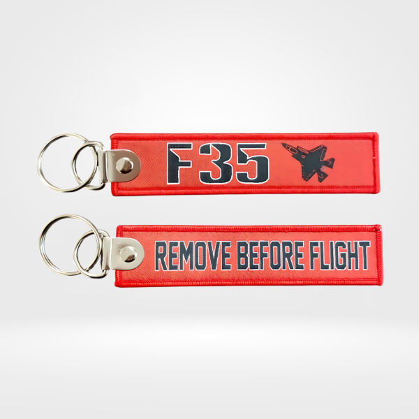 A bold red fabric keychain featuring an embroidered top-view silhouette of the F-35 fighter jet. Lightweight, durable, and perfect for military aviation fans, pilots, and collectors. Great for keys, bags, or everyday carry.